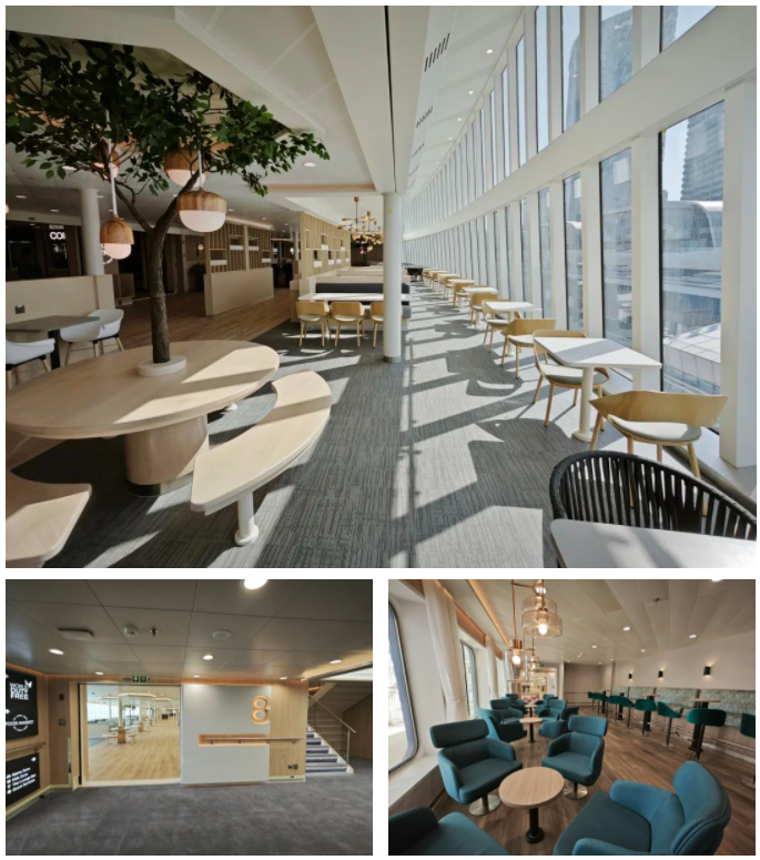 从船侧的舷梯登上这艘客滚船,首先映入眼帘的是一个像星级酒店一般的接待大厅,再走几步,就是带着落地大窗的餐厅,奢华感扑面而来。