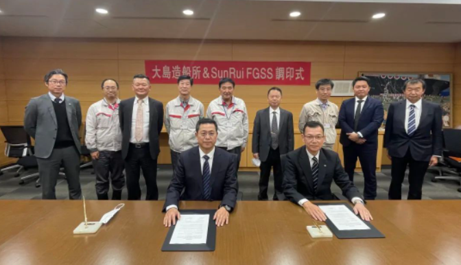 本次签约的FGSS设备将服务于大岛造船厂建造的2艘9.5万载重吨LNG动力煤炭运输船,标志着青岛双瑞研发的船用LNG供气系统已获得国外船厂、船东客户的肯定。七二五所所长王其红,大岛造船厂常务董事兼副厂长岩下达郎等共同见证双方签约。