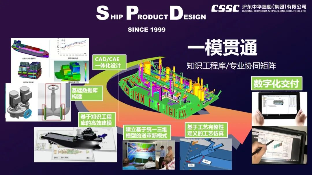 该项课题以沪东中华自主研发的全新三维设计软件SPD为平台,以知识工程库和专业协同矩阵为支撑,打造“一模贯通”业务模式,服务船舶产品从研发、详细设计、性能及工艺仿真、生产设计到数字化交付的全生命周期。