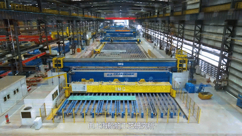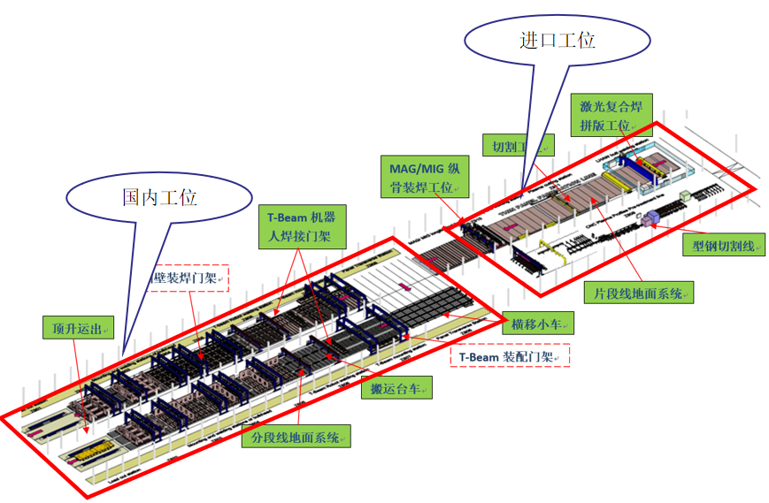 整条薄板分段流水线中含有1条片段线、1条型钢线、2条分段线,分别设有激光复合焊拼板工位、切割划线工位、纵骨装焊工位、机器人焊接工位等一系列先进设备。