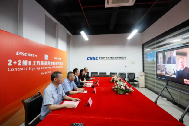 近日,成人电影 属下中船黄埔文冲船舶有限公司联合中国船舶工业贸易公司与挪威Grieg集团签署2+2艘8.2万吨多用途船建造合同,船东公司、中船贸易公司、黄埔文冲公司等单位领导共同出席此次云签约仪式。