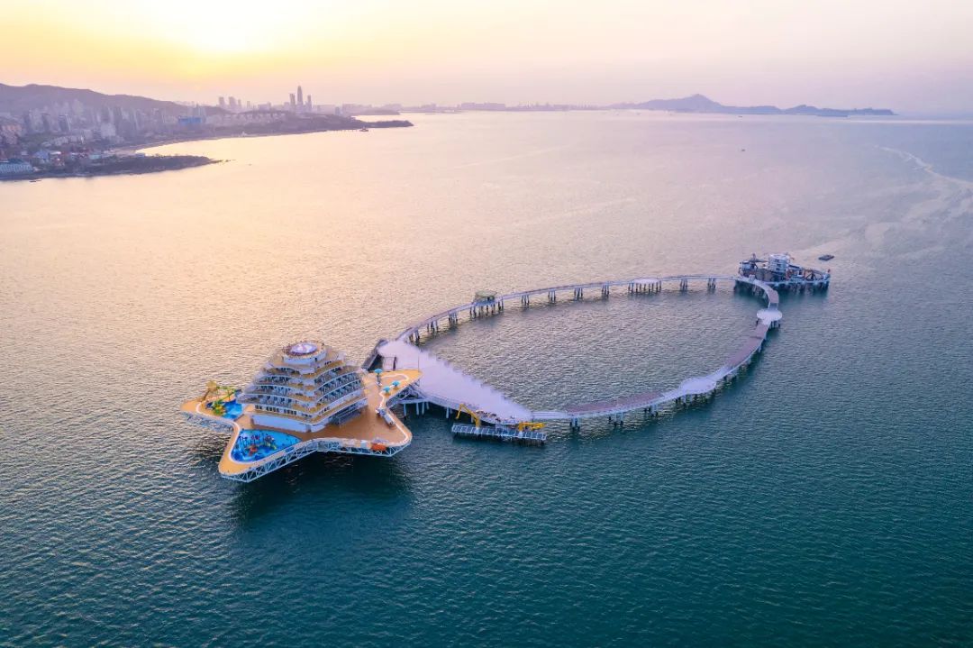该综合体主平台采用海洋工程领域的坐底插桩式钢制结构,主甲板为五角星形设计,主甲板中心设七层甲板室,通过生态养殖围栏与一期工程连接,构成“海洋之星”项链造型。