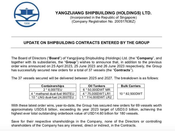 6月26日晚间,扬子江船业(控股)有限公司发布公告称,江苏扬子江船业集团公司2023年以来已承接69艘新船订单,价值约56亿美元,已超过30亿美元的年度目标。截至目前,江苏扬子江船业集团公司手持订单达180艘、146亿美元,再创历史最高纪录。