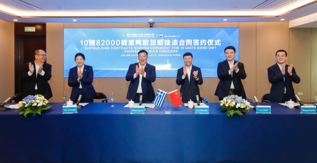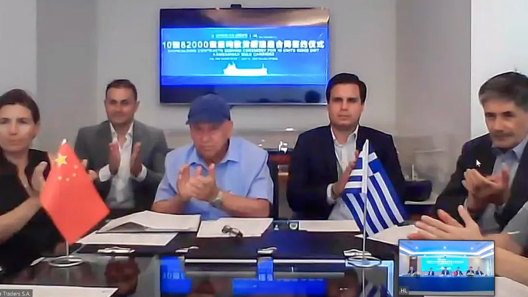 7月11日是我国第19个航海日,当天,恒力造船(大连)有限公司与希腊著名船东海易公司隆重举行10艘8.2万吨散货船建造合同线上签约仪式,恒力集团董事长、总裁陈建华,海易公司创始人George Procopiou出席仪式并致辞,上海船舶设计院院长吕智勇见证签约。