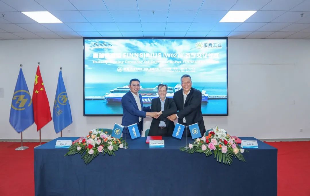 7月18日,招商工业威海金陵为意大利Grimaldi集团旗下Finnlines Plc公司建造的首艘5100米车道/1100客位高端客滚船Finnsirius顺利交付。Finnlines船东公司新造船经理Juha Ahia,威海金陵总经理郑和辉、副总经理刘鑫男出席仪式并签署交船文件。