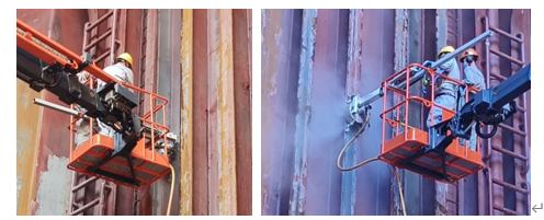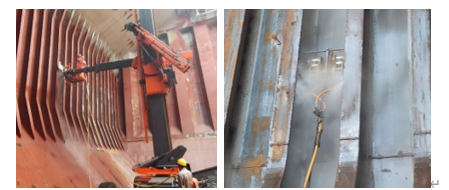 业内人士周知,与外板的大平面除锈作业相比,散货船货舱内部的结构复杂,尤其是T型材肋骨、波型舱壁等非大平面区域的除锈作业,一直是行业内超高压水射流除锈在货舱内全面应用的技术瓶颈。目前,船舶修理企业使用的除锈方法主要是采用人工手持高压水枪除锈作业方式,存在作业效率低,除锈区域受限,除锈质量难以达标等问题。特别在货舱肋骨面板的反面位置,手持高压水枪无法对这一区域进行作业。这些已成为船东和涂料服务商特别关注但又难以解决的关键问题。
