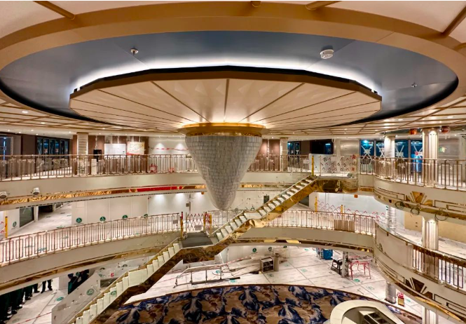 其中,舱室、餐饮等区域的内装工程基本接近尾声,乘客梯道、影院剧场、中庭广场、水上乐园、高空绳索运动项目等公共区域建成或基本建成,整体进度达到95%。