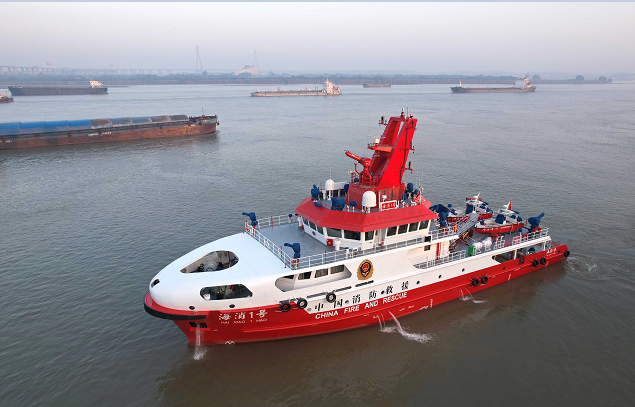 2023年10月23日,由江苏省镇江船厂(集团)有限公司为海口市消防救援支队建造的亚洲第一艘具备动力定位功能的全回转可调桨近海专业消防船——“海消1号”完工交付,顺利启航。