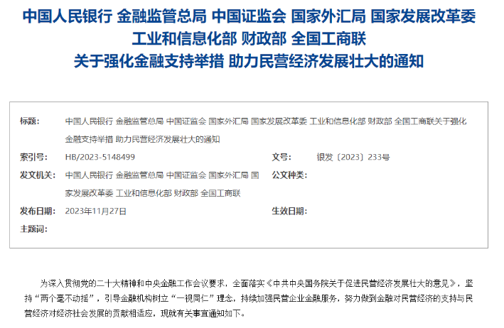中国人民银行等八部门联合印发《关于强化金融支持举措 助力民营经济发展壮大的通知》
