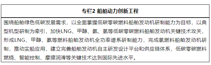 (六)加快绿色动力系统研发应用。实施船舶动力创新工程,提升传统燃油、LNG船用发动机效率,稳步扩大LNG船用发动机市场应用规模;推进甲醇、氨燃料等低碳零碳燃料船用发动机核心技术攻关,形成全功率谱系甲醇和氨燃料发动机研制能力,实现规模示范效应;积极稳妥扩大燃料电池、动力电池在船舶的应用范围;兼顾液化石油气(LPG)、生物柴油、乙醇等燃料船用发动机发展,开展氢燃料船用发动机技术研发,满足航运市场多元化绿色低碳发展需求。加快新能源燃料供给系统、尾气后处理系统、污染物排放监控系统等研发应用。