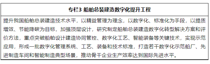 (八)建立先进船舶总装建造体系。实施船舶总装建造数字化提升工程,加快船舶总装建造数字化转型,加强精益管理,以数字化、标准化为手段,推动船舶总装建造企业提质增效、节能降碳,促进5G、工业互联网等新一代信息技术融合应用。依托工业互联网平台,加强船舶设计制造协同管控,推动构建船厂数字基座,建立船厂供应链协同管控、并行建造资源调度与管理、质量安全环保(QHSE)、能源及碳足迹管控等全流程数字化协同管控体系,提升船厂数字化与精益管理水平。加快数字化工艺、智能装备等关键技术攻关和示范应用,打造数字车间和智能船厂。