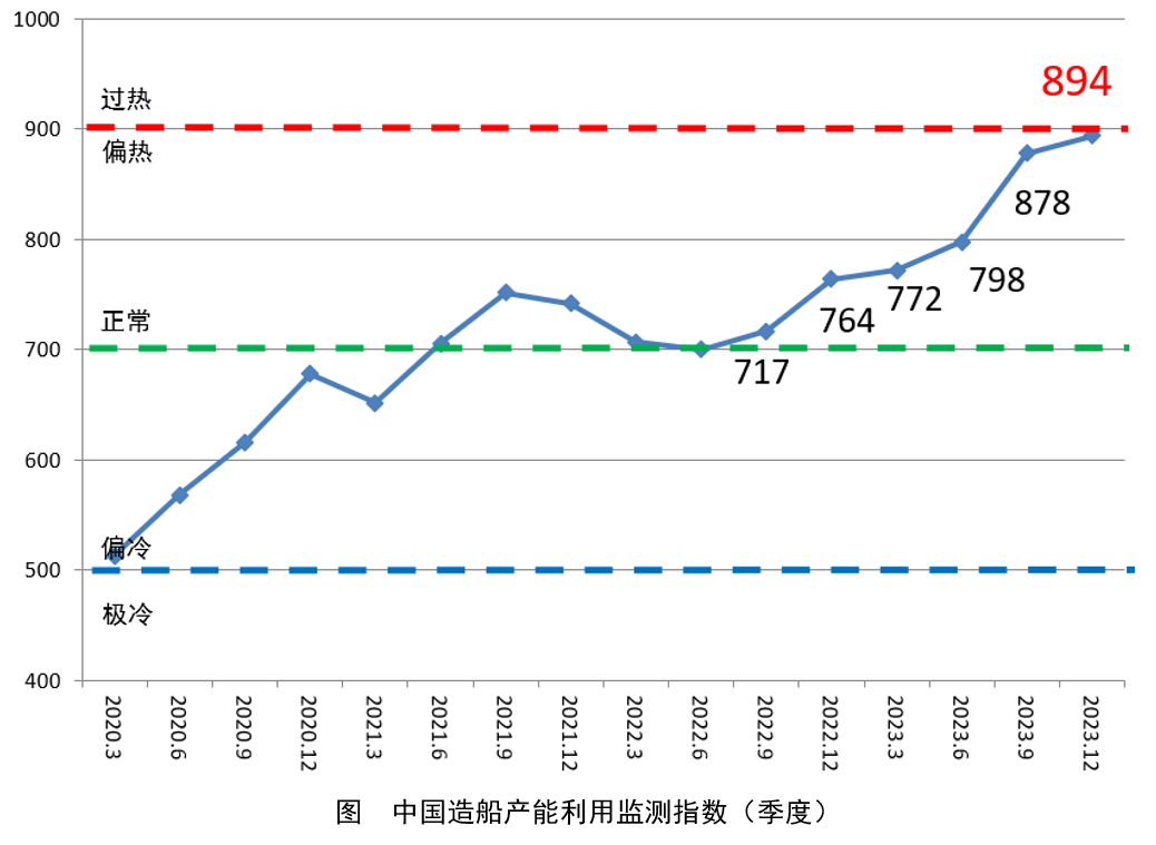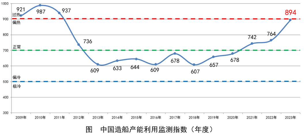 2023年中国造船产能利用监测指数(CCI)894点,与2022年相比提高130点,同比增长17.0%。从全年来看,CCI呈现逐季增长的态势。