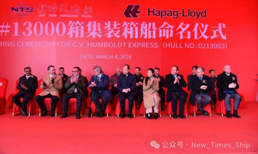 3月4日上午,3#13000箱集装箱船命名交付仪式在浙江舟山隆重举行,公司总经理刘海金先生、常务副总经理张玉永先生与教母Brenda Hojgaard女士、船东赫伯罗特公司船队总经理Richard von Berlepsch先生,高级总监Lutz-Michael Dyck先生,Anglo-Eastern Univan Group(中英船舶管理公司)首席执行官Bjorn Hojgaard先生,中英船务技术服务有限公司总经理Arunava Sengupta先生,Chartworld航运公司新造船部经理Spyros Papandreou先生,法国船级社高级副总裁Alex Gregg-Smith先生,法国船级社新造船部中国区经理Christophe Vaes等嘉宾出席活动。
