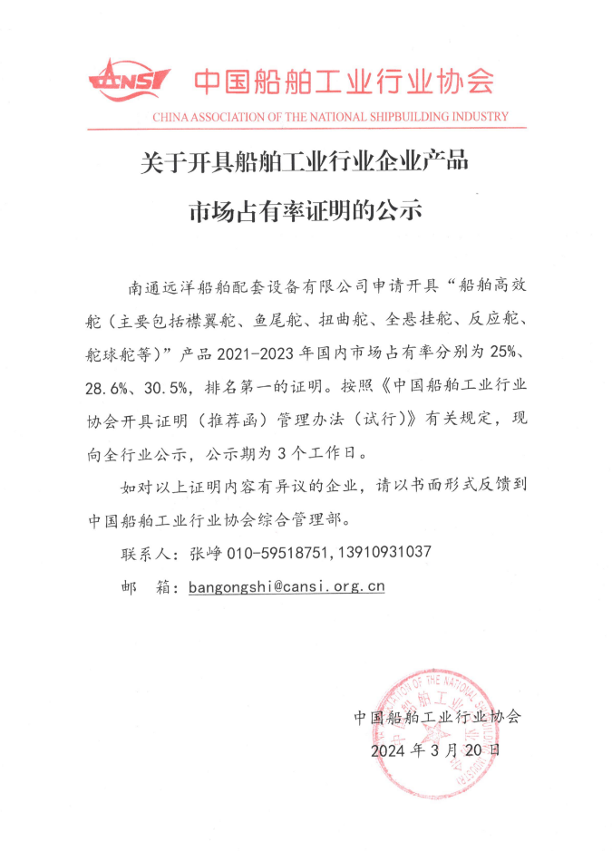 关于开具船舶工业行业企业产品市场占有率证明的公示