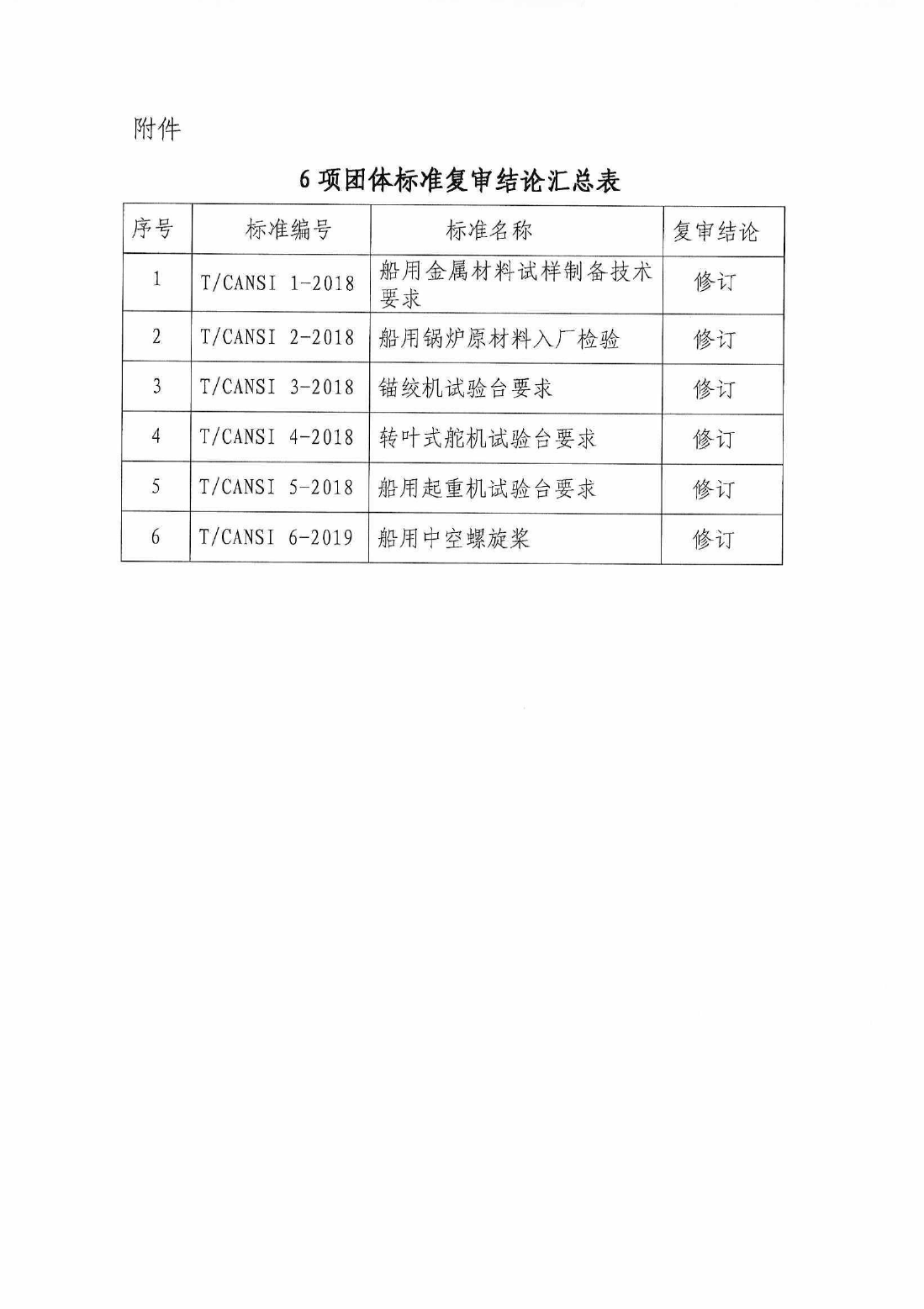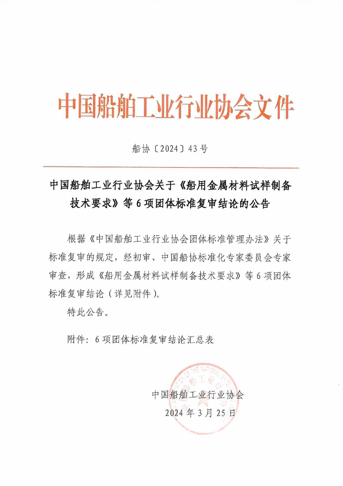 中国船舶工业行业协会关于《船用金属材料试样制备技术要求》等6项团体标准复审结论的公告
