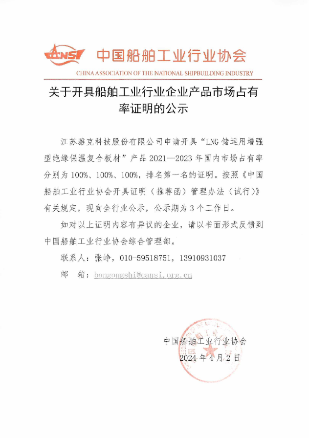 关于开具船舶工业行业企业产品市场占有率证明的公示