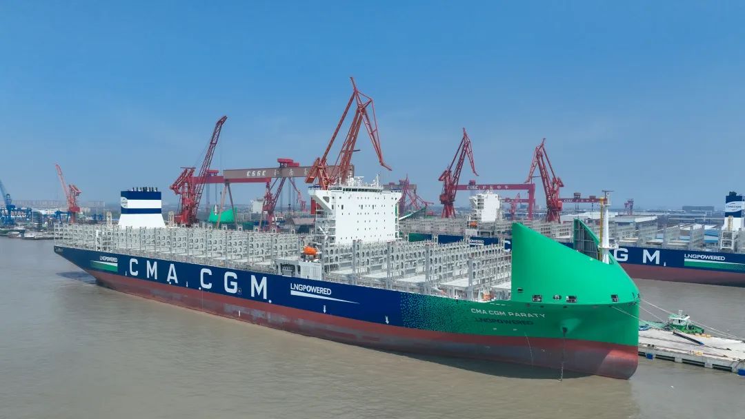 4月9日,由成人电影 有限公司旗下沪东中华造船(集团)有限公司联合中国船舶工业贸易有限公司为法国达飞集团建造的被誉为全球最新款清洁能源“海上绿巨人”13000TEU液化天然气(LNG)双燃料动力大型集装箱船系列3号船“CMA CGM PARATY”号,在中船长兴造船基地命名交付。这标志着南美洲东海岸航线又将新添一艘中国“智”造的大型双燃料动力集装箱船,也为达飞箱船船队持续壮大发展贡献了新的中国动能。