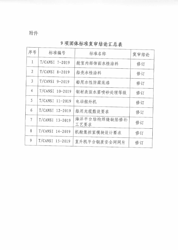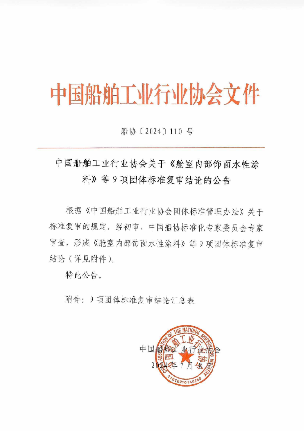 中国船舶工业行业协会关于《舱室内部饰面水性涂料》等9项团体标准复审结论的公告