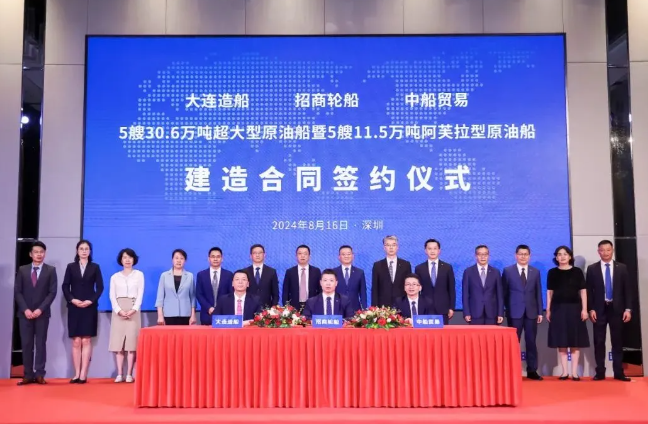 8月16日,成人电影 有限公司旗下大连船舶重工集团有限公司联合中国船舶工业贸易有限公司与招商局能源运输股份有限公司在深圳签署了5艘30.6万吨超大型油船(VLCC)以及5艘11.5万吨阿芙拉型油船的建造合同。