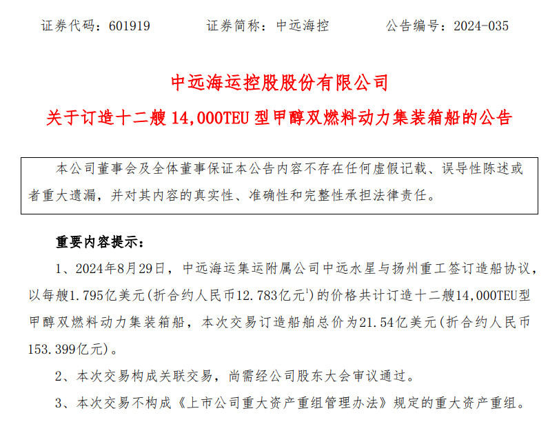 8月29日,中远海运控股股份有限公司正式发布公告称,其全资子公司中远海运集装箱运输有限公司运附属公司中远(开曼)水星有限公司已与扬州中远海运重工有限公司,签订12艘14000TEU甲醇双燃料动力集装箱船建造协议。该笔交易总价值为21.54亿美元,约合153.399亿元人民币。