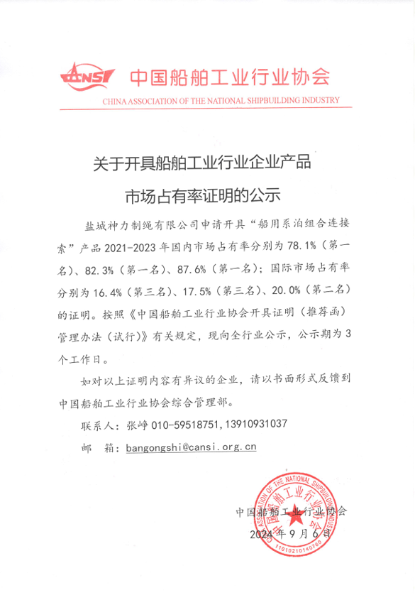 关于开具船舶工业行业企业产品市场占有率证明的公示