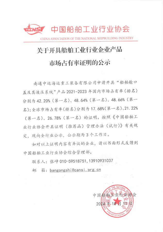 关于开具船舶工业行业企业产品市场占有率证明的公示