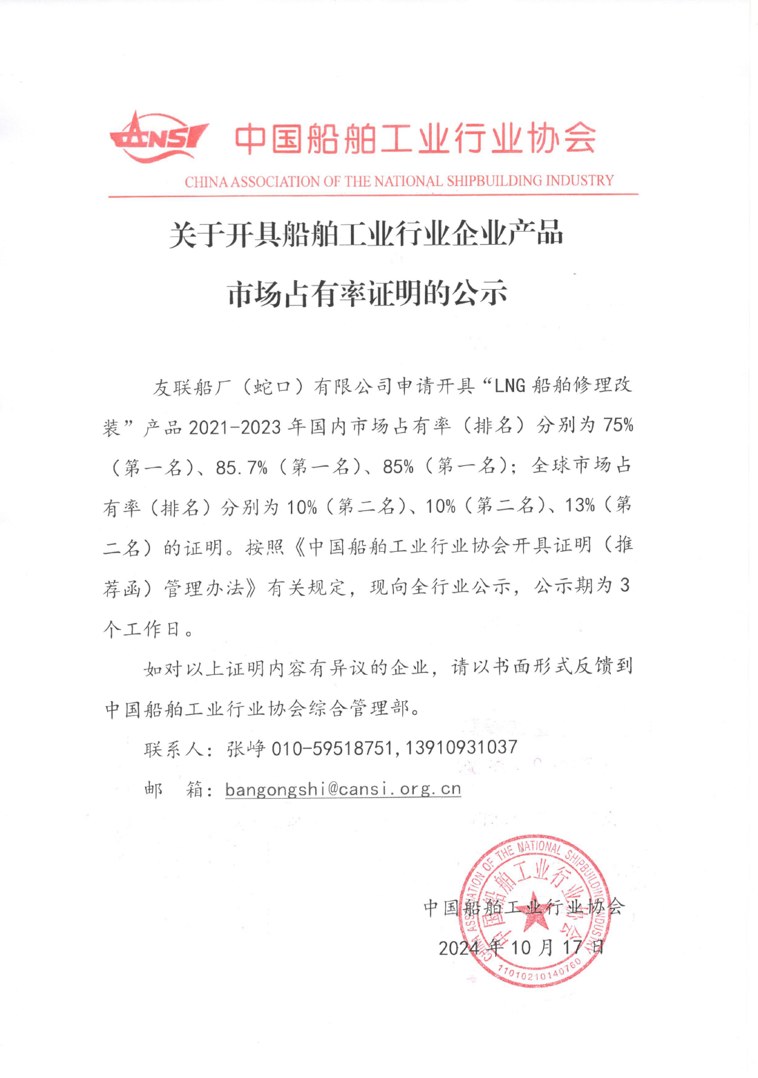 关于开具船舶工业行业企业产品市场占有率证明的公示