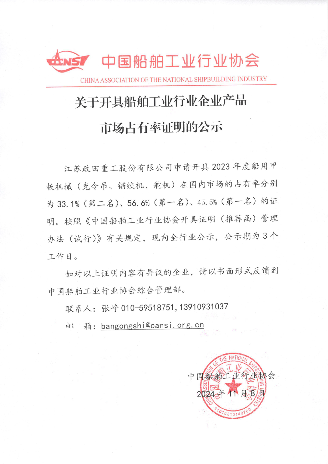 关于开具船舶工业行业企业产品市场占有率证明的公示
