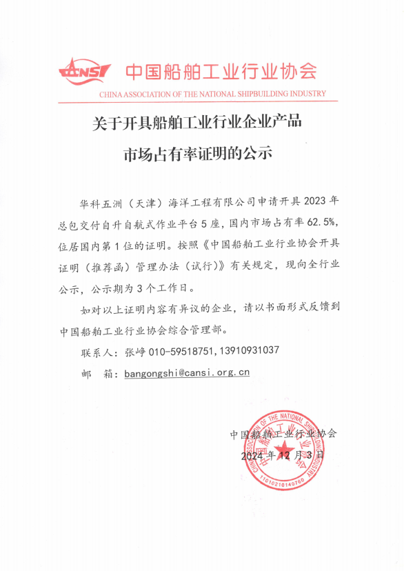 关于开具船舶工业行业企业产品市场占有率证明的公示