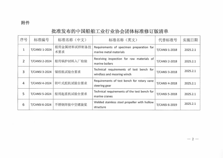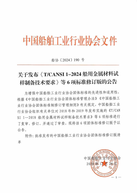关于发布《T/CANSI1-2024船用金属材料试样制备技术要求》等6项标准修订版的公告