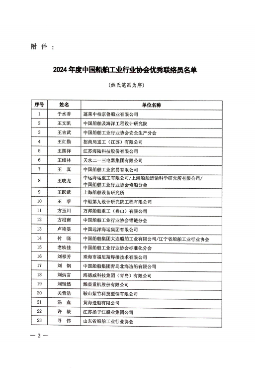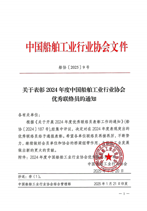 关于表彰2024年度中国船舶工业行业协会优秀联络员的通知