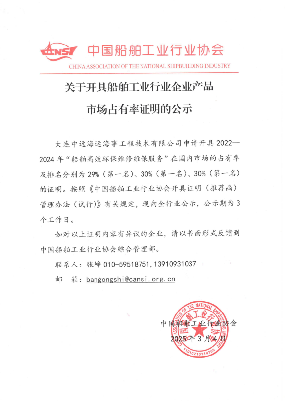 关于开具船舶工业行业企业产品市场占有率证明的公示