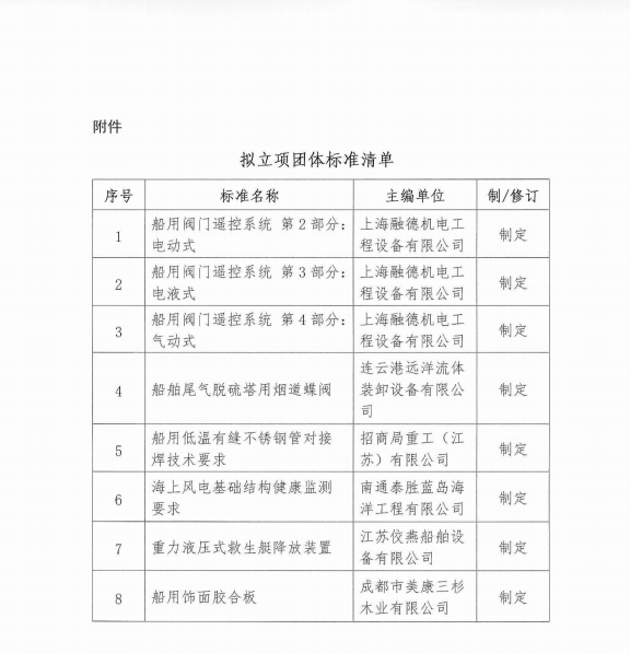 中国船舶工业行业协会关于《船用阀门遥控系统部分:电动式》等8项团体标准的立项公示