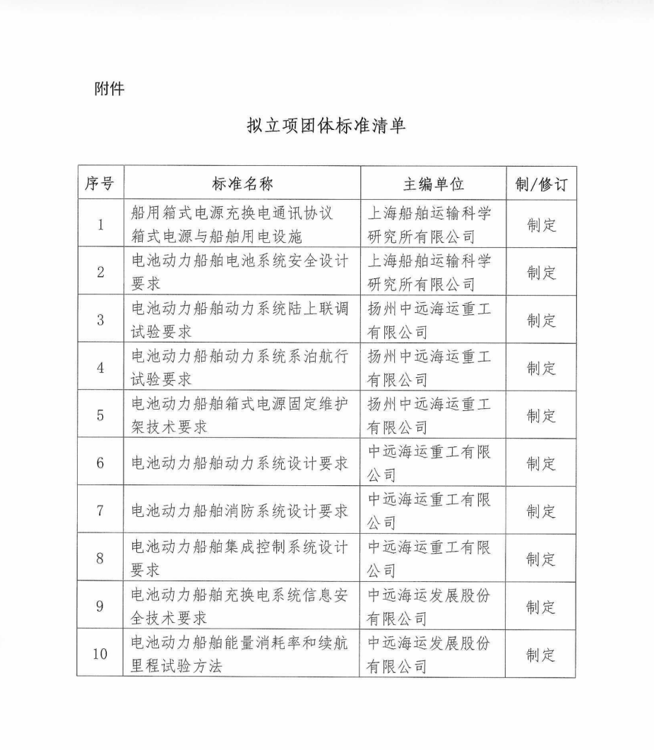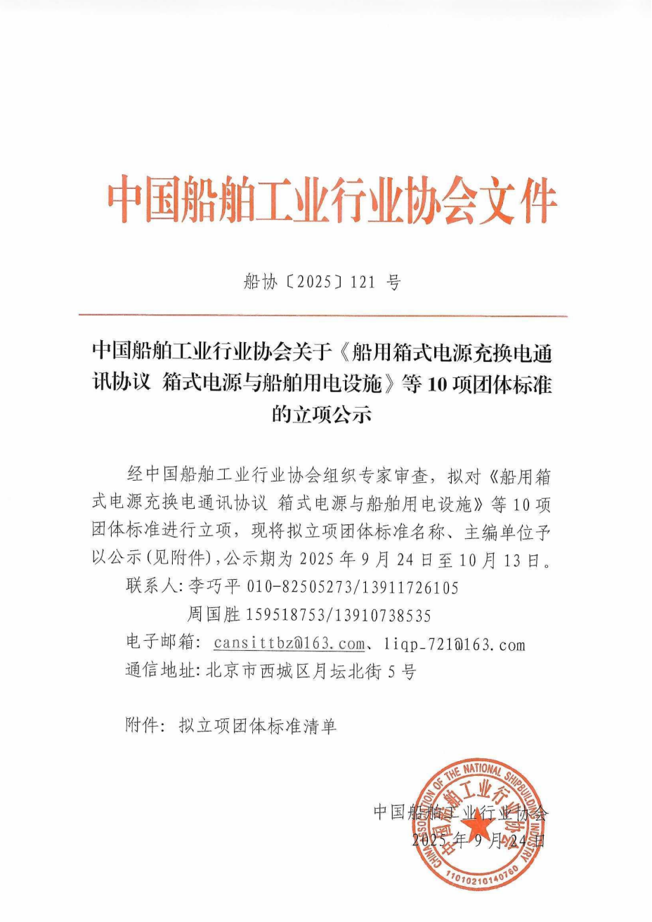中国船舶工业行业协会关于《船用箱式电源充换电通讯协议箱式电源与船舶用电设施》等10项团体标准的立项公示