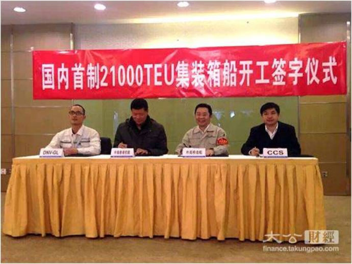 10月30日在上海正式签订了6艘21000标箱集装箱船建造合同。这批世界最大、最新的超大型集装箱船,由中船集团为中海集团量身打造,建成后将加入中海集装箱运输股份有限公司的船队运营。