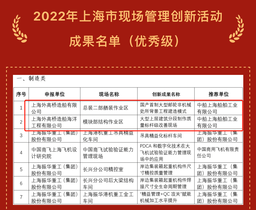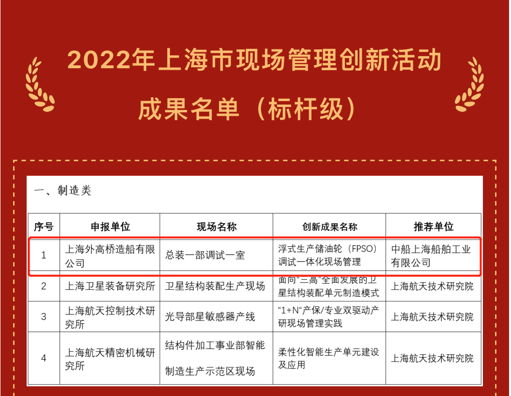 公司总装一部调试一室创新成果“浮式生产储油轮FPSO调试一体化现场管理”荣获“标杆级”荣誉称号,是该群众性质量活动的最高荣誉;总装二部舾装作业区创新成果“国产首制大型邮轮非机械处所背景工程建造模式”、外高桥海工模块部结构作业区创新成果“大型上层建筑分段制作质量标杆级改善现场”荣获“优秀级”荣誉称号。