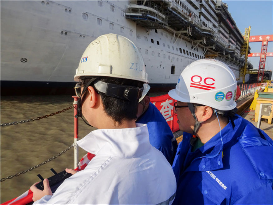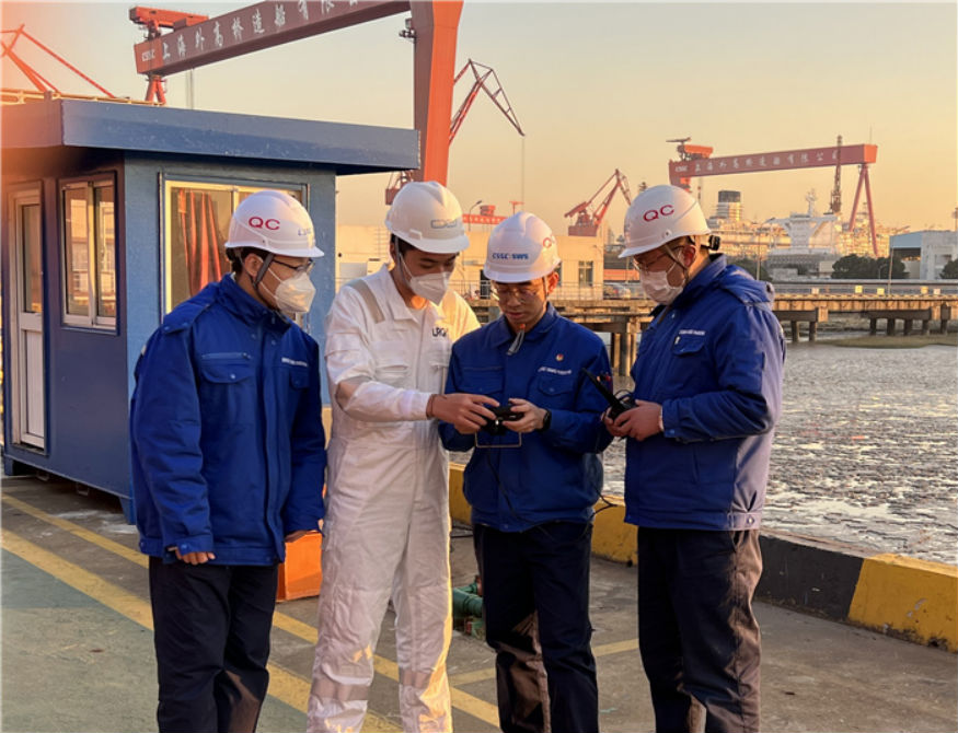 特别值得关注的是,2021年12月17日,国产首制大型邮轮坞内起浮期间,无人机“飞检”技术成功实现应用。经测算,坞内起浮时水线恰好位于船艉平底处,无法利用常规方式读取水尺。公司与中国船级社成立联合检验小组,并创新运用5G+实时远程技术,克服了坞内无人机GPS信号不稳定、系泊缆绳布置复杂等挑战,有力保障了无人机抵近、稳定飞行,邮轮坞内起浮称重工作顺利完成。
