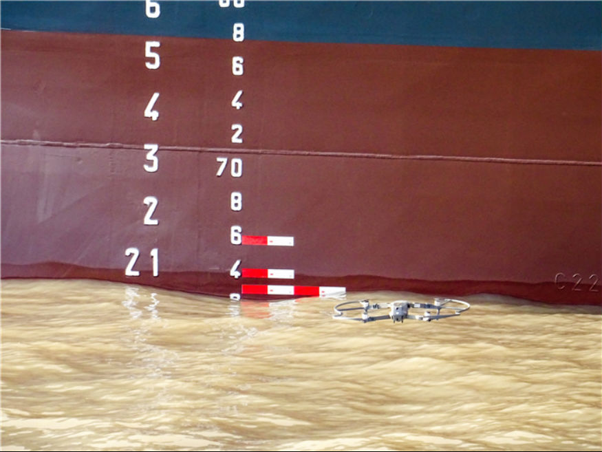 以空船称重检验为例。在传统模式下,船东、船检、船厂三方检验人员必须乘坐拖轮绕船一周,才能获得相关数据。数值易受到拖轮波浪影响,且拖轮租用成本较高,人员在拖轮上动态作业存在一定的安全隐患。在“飞检”模式下,工作人员在岸上通过操纵无人机仅需15分钟即可完成船舶称重的数值读取和记录,不仅消除了水上作业的安全隐患,节省了拖轮成本,提升了数据精准性与时效性,还可以充分利用无人机灵活机动的特点,全方位的拍摄存储高清的影像资料,为船舶数据采集管理提供支持。